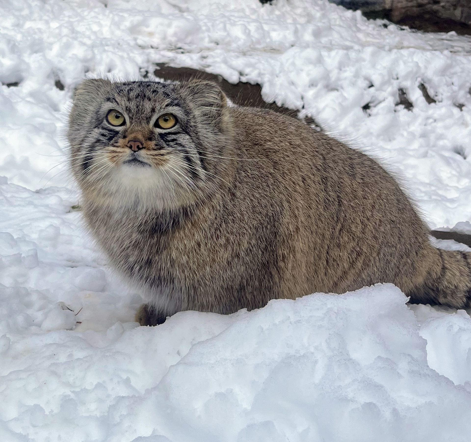 Distinguishing Characteristics: Pallas's cats have a small spherical head, a thick build, short stocky legs, and a thick furry tail that does not thin or become pointed at the end like other felines. They have a short, protruding muzzle and a large forehead with bulging, large eyes, set low and directed forward, which gives the impression of a ‘flat face.’ This is intensified by the shape of their broad ears and the large bunches of elongated hairs growing on their cheeks and under their ears. Pallas's cats have very long, fluffy, silky fur with white-tipped guard hairs that project over a darker undercoat.