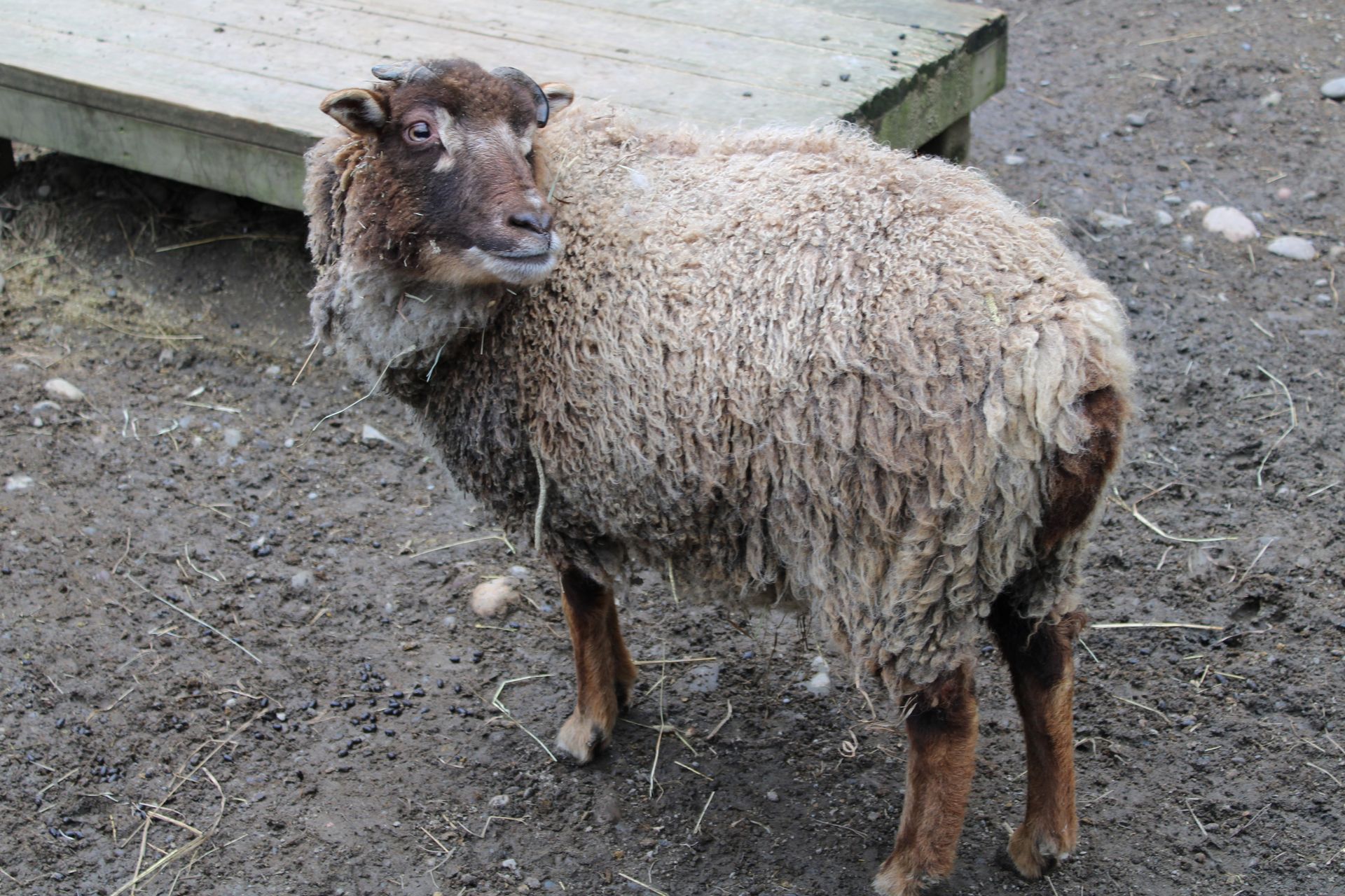 Distinguishing Characteristics: The Shetland is one of the smallest British breeds. The ewes are usually polled (hornless) and the rams are usually horned, although horned ewes and polled rams do occur occasionally. They are small-bodied animals, with some wool on their faces, noses or legs, but not in excess like other breeds. The legs are medium length and finely-boned. They have small, erect ears. A distinguishing feature of Shetland sheep is the short, fluke-shaped tail, which is broad at the base, tapers to a point, and is covered in hair, not wool.