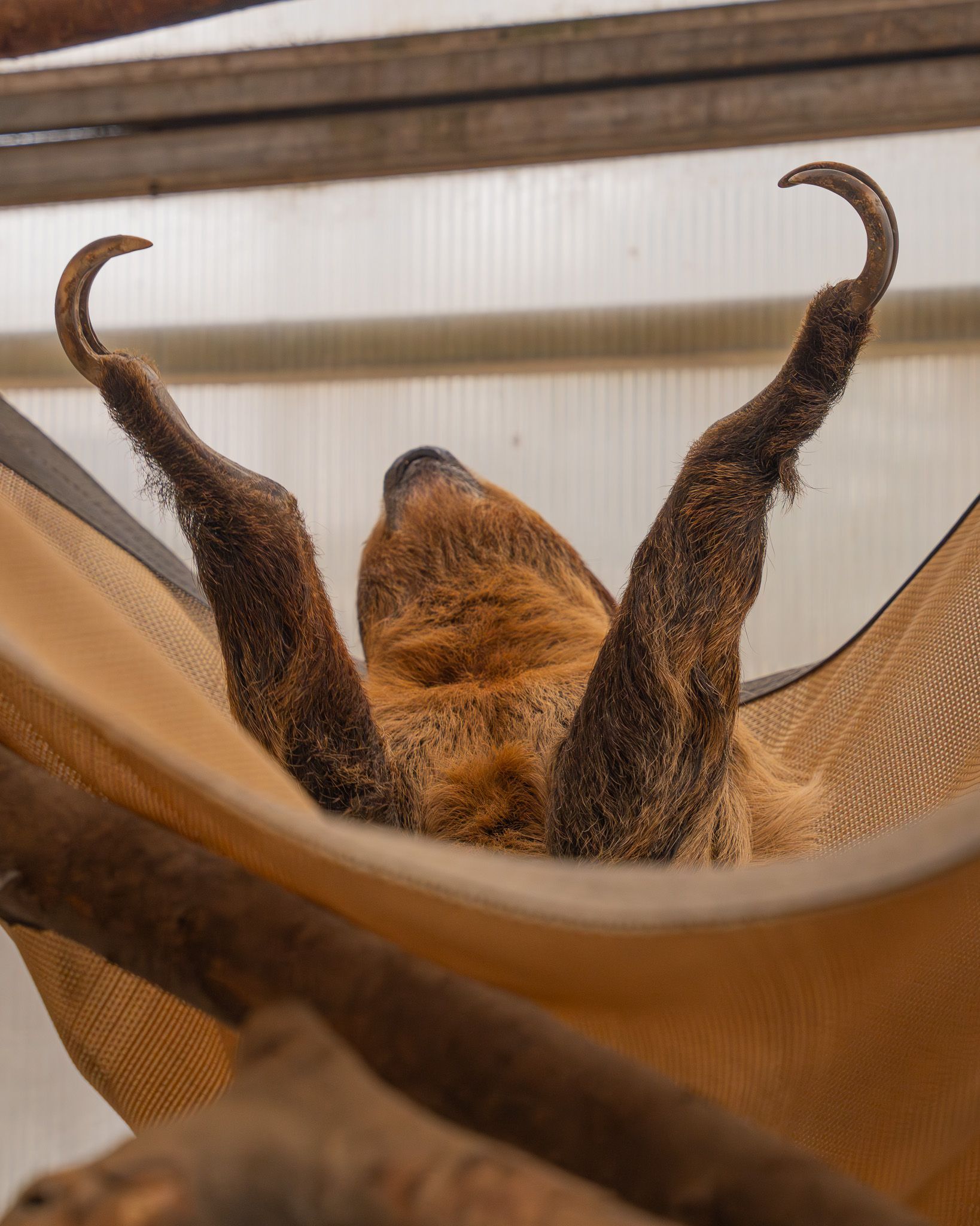 The mother gives birth while hanging upside down. The young are born with claws, and hang onto their mom for about five weeks until they have the strength to go on their own.